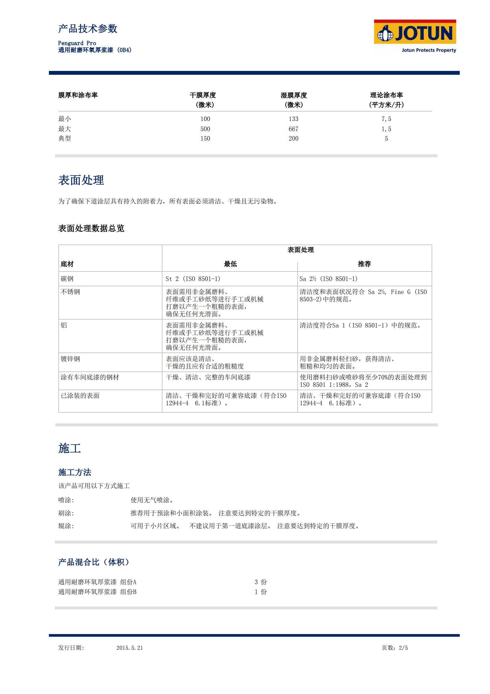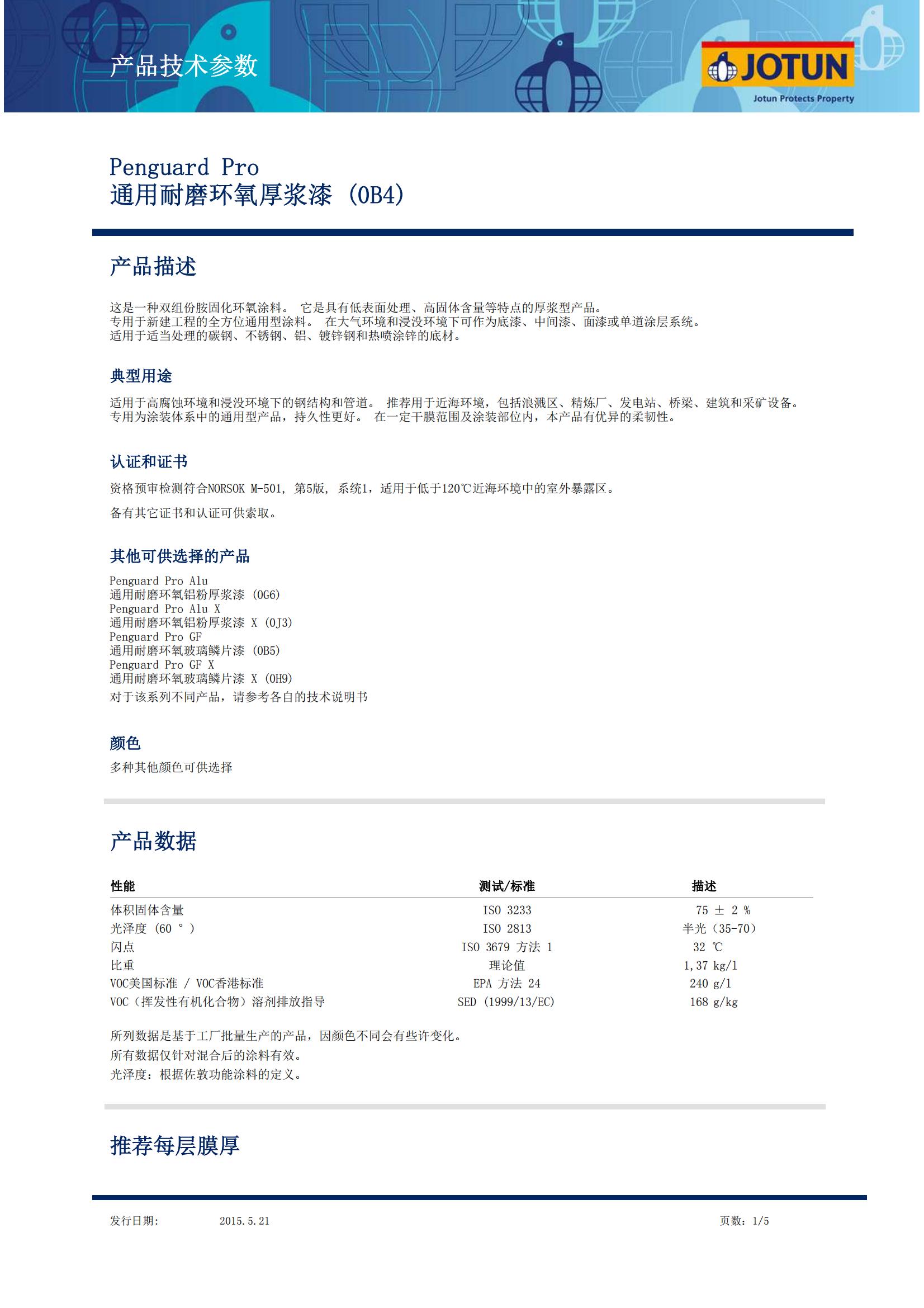 • Penguard Pro 0B4:這是一種雙組份胺固化環氧涂料。 它是具有低表面處理、高固體含量等特點的厚漿型產品。專用于新建工程的全方位通用型涂料。 在大氣環境和浸沒環境下可作為底漆、中間漆、面漆或單道涂層系統。適用于適當處理的碳鋼、不銹鋼、鋁、鍍鋅鋼和熱噴涂鋅的底材。適用于高腐蝕環境和浸沒環境下的鋼結構和管道。 推薦用于近海環境,包括浪濺區、精煉廠、發電站、橋梁、建筑和采礦設備。專用為涂裝體系中的通用型產品,持久性更好。 在一定干膜范圍及涂裝部位內,本產品有優異的柔韌性